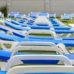 Der Strand des Hotels bietet den Gästen Lounge-Sessel und Sonnenschirme.